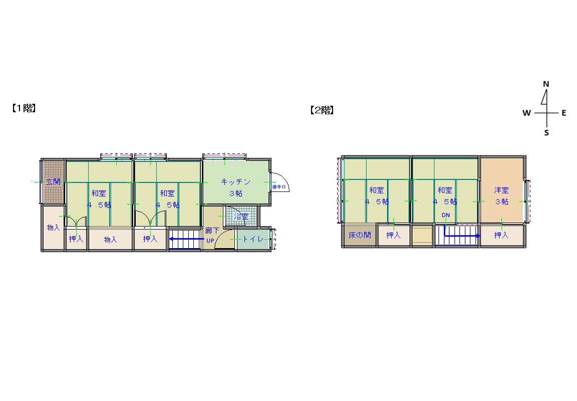 | 間取り詳細 | 1階:キッチン、風呂、トイレ、和室4.5帖×2 2階:和室4.5帖、洋室4帖 |