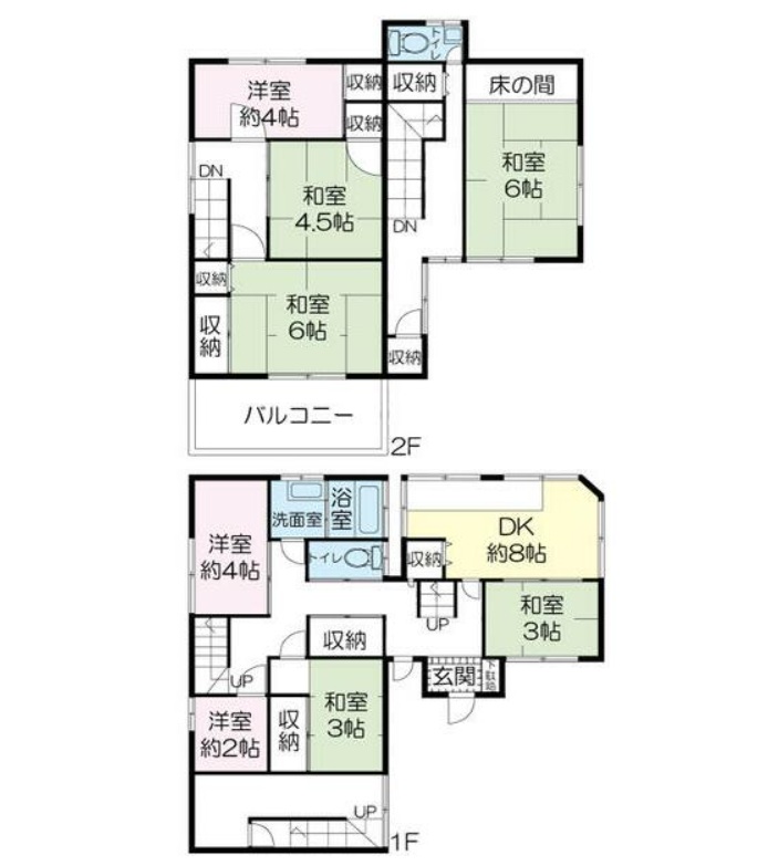 | 間取り詳細 | 1階:DK8帖、風呂、トイレ、和室3帖×2、洋室4帖、2帖 2階:和室6帖×2、4.5帖、洋室4帖 |